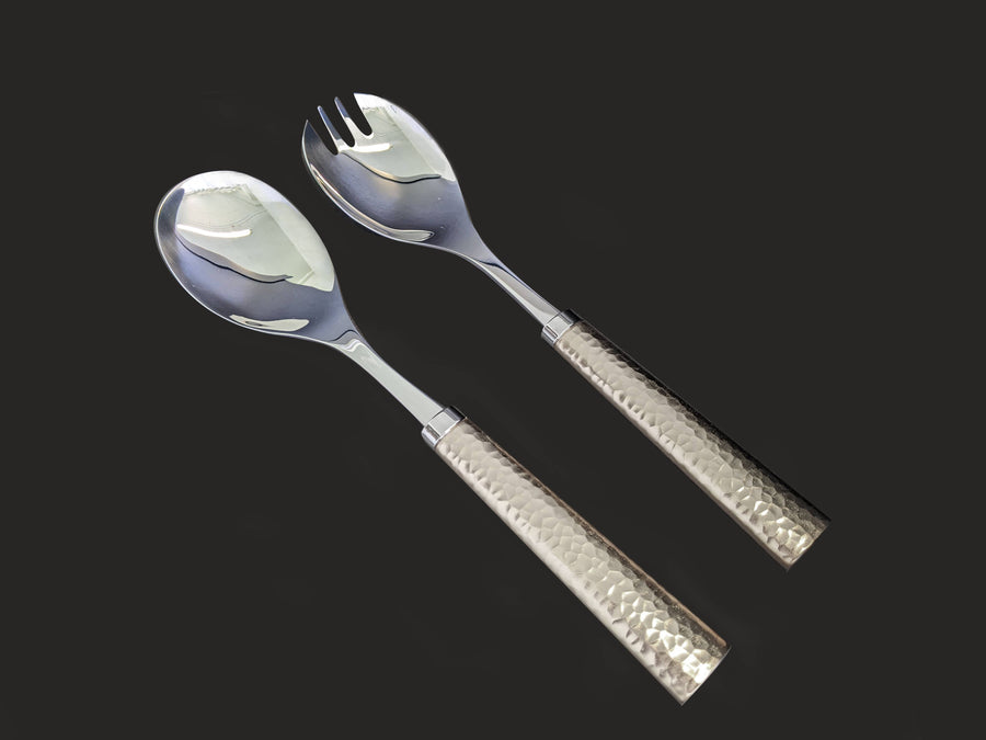 Stainless Steel Salad Server in two tone hammered design Handle Color: Gold or Silver Stainless steel salad server in two tone hammered design - Silver Handle Set Includes: 1) Salad Spoon 10" L 2) Salad Fork (Spork) 10" L